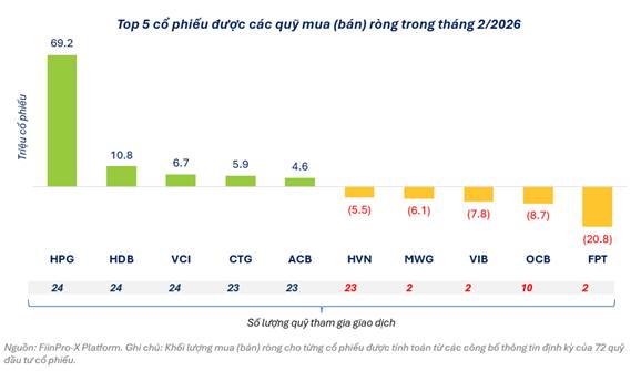 - HPG là cổ phiếu được các quỹ mua ròng nhiều nhất theo khối lượng trong tháng 2/2026.Ngược lại, FPT và các cổ phiếu có vốn nhà nước (OIL, PVT) bị bán ròng mạnh.