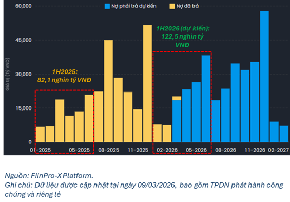 - Áp lực thanh toán TPDN dự kiến gia tăng từ tháng 3 và Q2/2026, nâng tổng nghĩa vụ gốc và lãi trong 6 tháng đầu năm 2026 lên khoảng 122,5 nghìn tỷ đồng (+49,2% YoY), chủ yếu đến từ khối Phi ngân hàng, đặc biệt là Bất động sản.