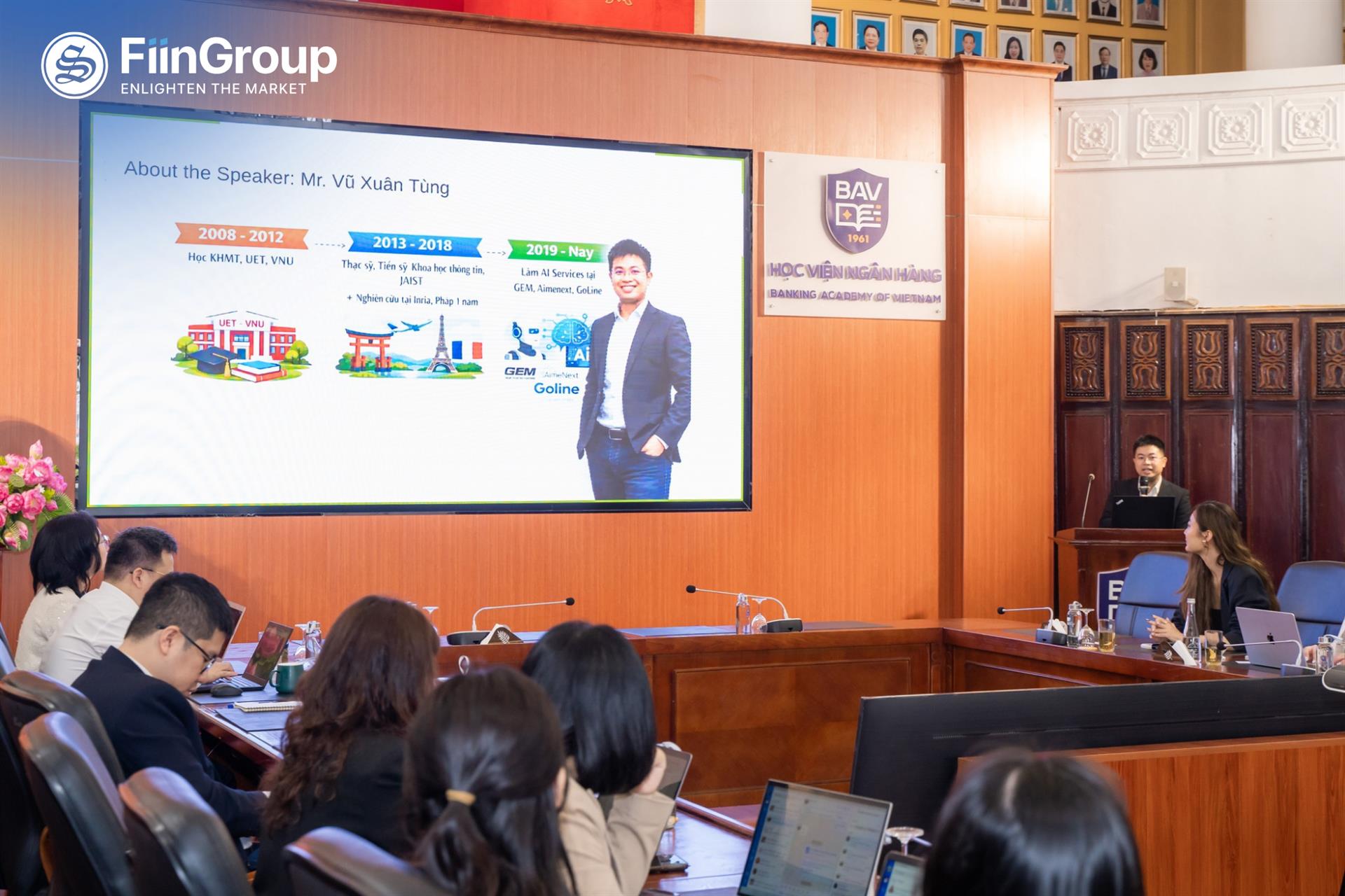 ThS. Trương Thị Minh Trang – Giám đốc Điều hành Khối Dịch vụ Thông tin Tài chính, FiinGroup cùng TS. Vũ Xuân Tùng – Kỹ sư Giải pháp AI tại Goline đồng hành cùng các giảng viên và sinh viên